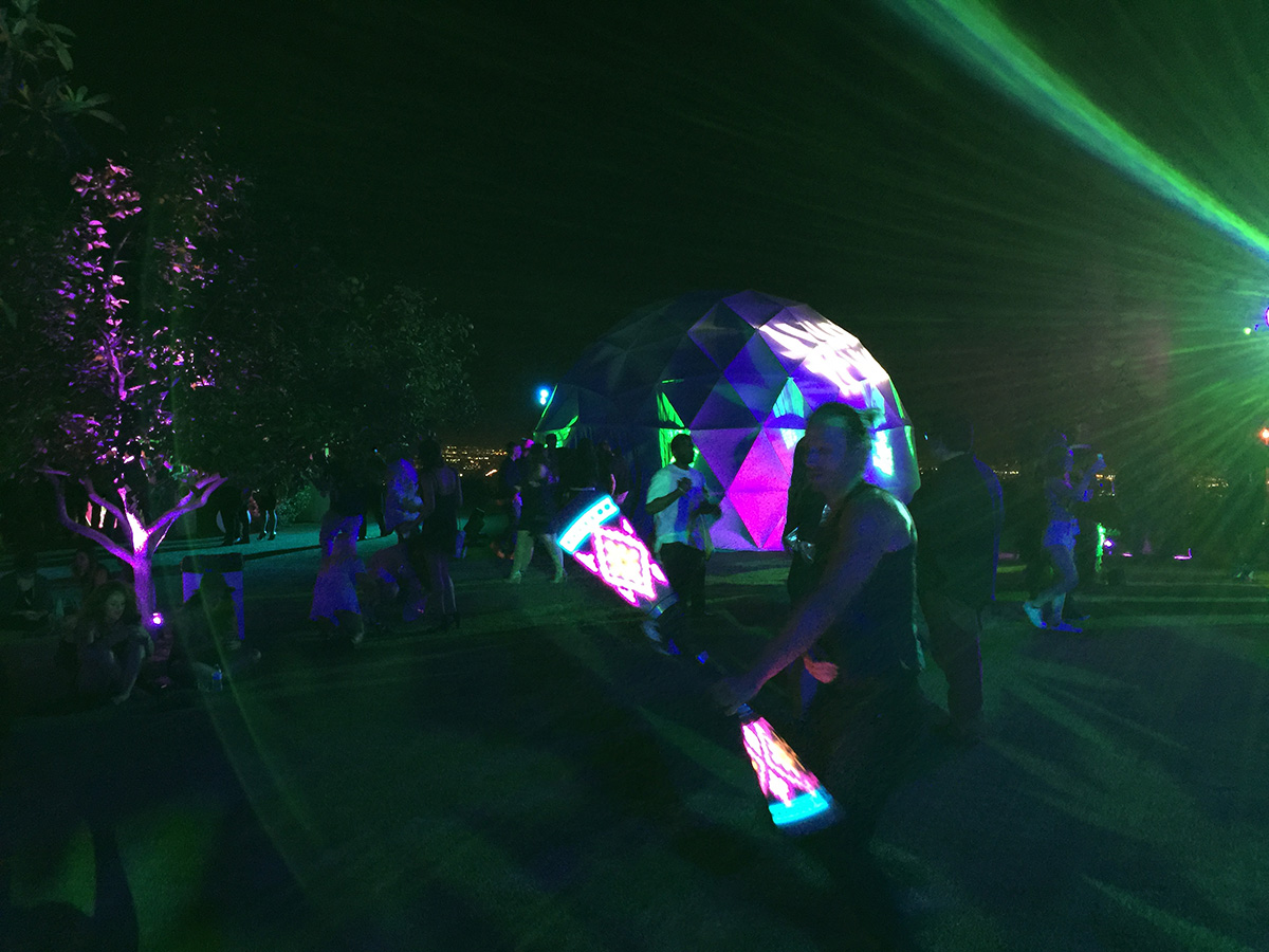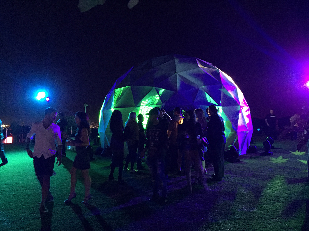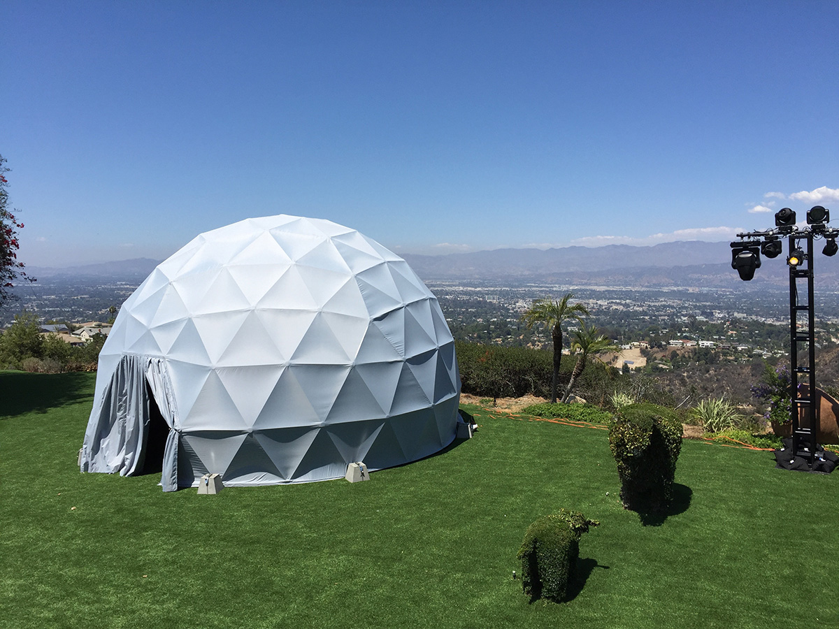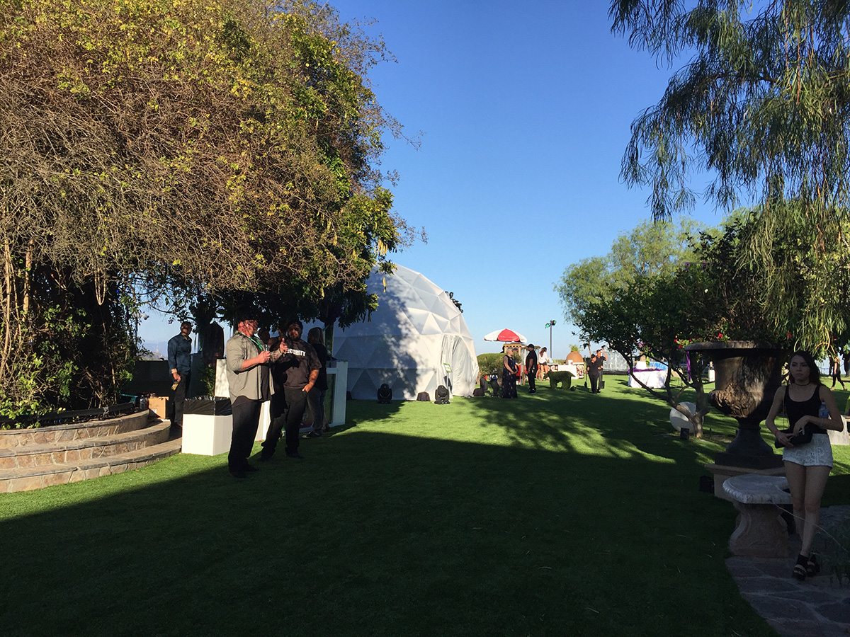 As the August sun set over the Hollywood Hills, trapeze artists swung above the guests at a private mansion perched at the top of a canyon, the 7 meter (23 foot) dome on the lawn came to life with lasers playing on its outer shell. High above the skyline of Los Angeles the 600 lucky party goers enjoyed a variety of food and treats in the mansion and stunning immersive visuals in the dome. A four projector system showed content at 3K resolution, opening eyes to the potential of 360 immersive environments, entertaining audiences and blowing minds. Portable domes and projection systems from Fulldome.pro make dome cinema practical for short term events like parties. Our small team was able to quickly set up the dome on the afternoon before the party and pack up again the morning after.